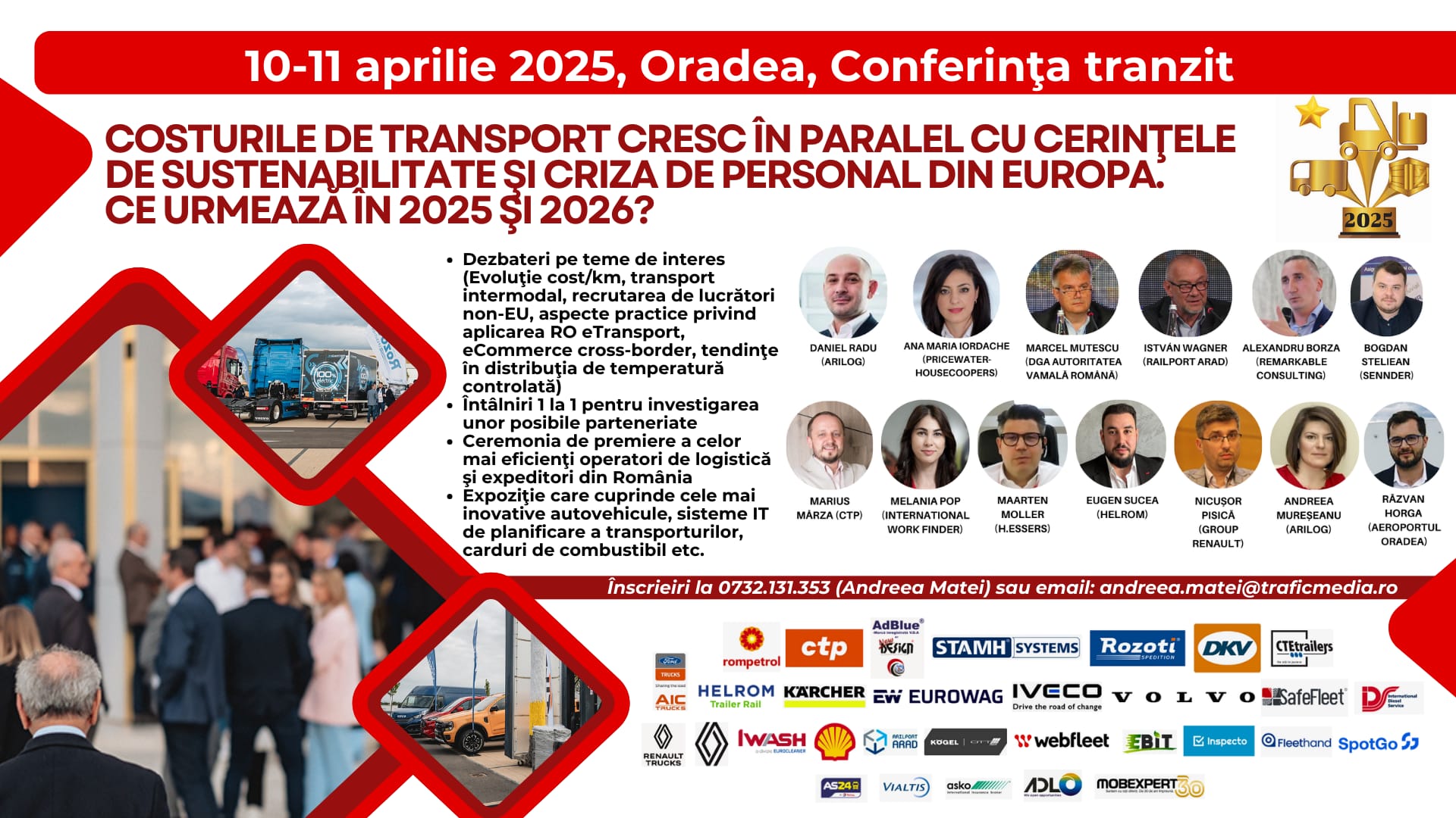 Pe 10 aprilie, la Oradea, revista Tranzit organizează Gala de premiere a celor mai eficiente companii de Logistică Contractuală, Expediții Rutiere, Expediții Air & Sea, Curierat și Transport Intermodal. De asemenea, un manager de logistică va fi recompensat pentru activitatea din anul anterior, fiind acordat și premiul pentru Vanul Internațional al Anului 2025.