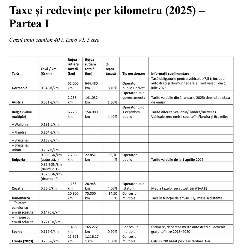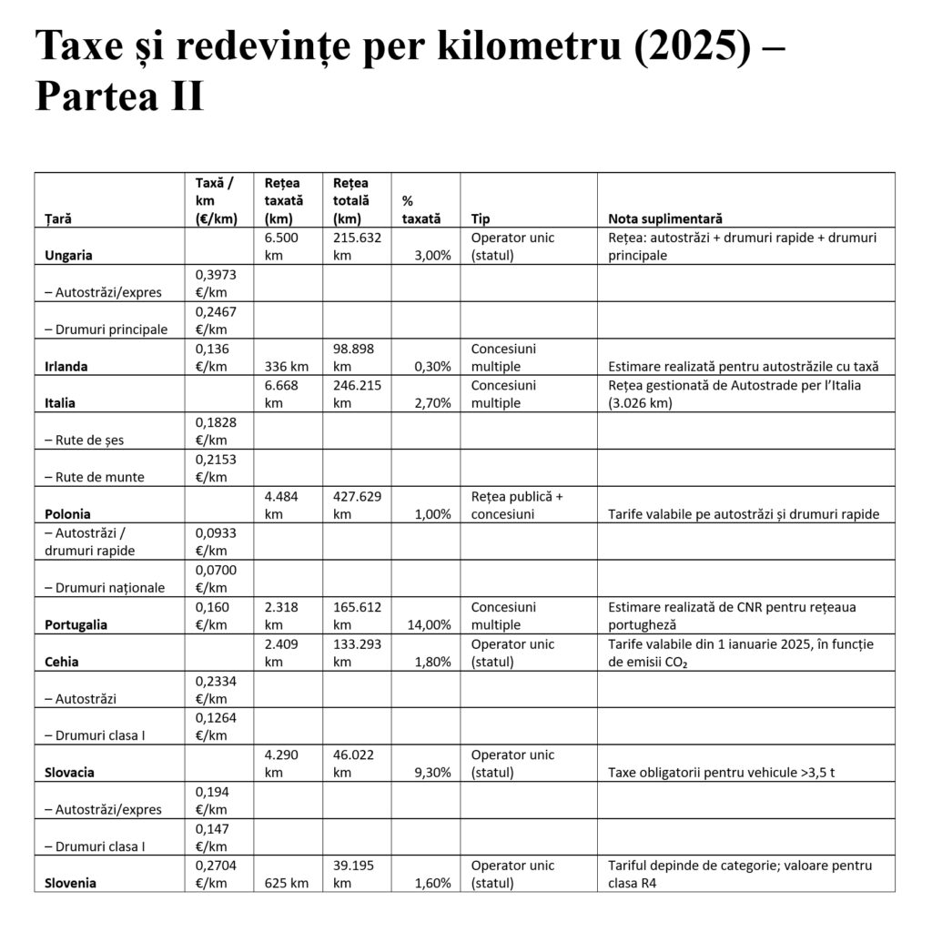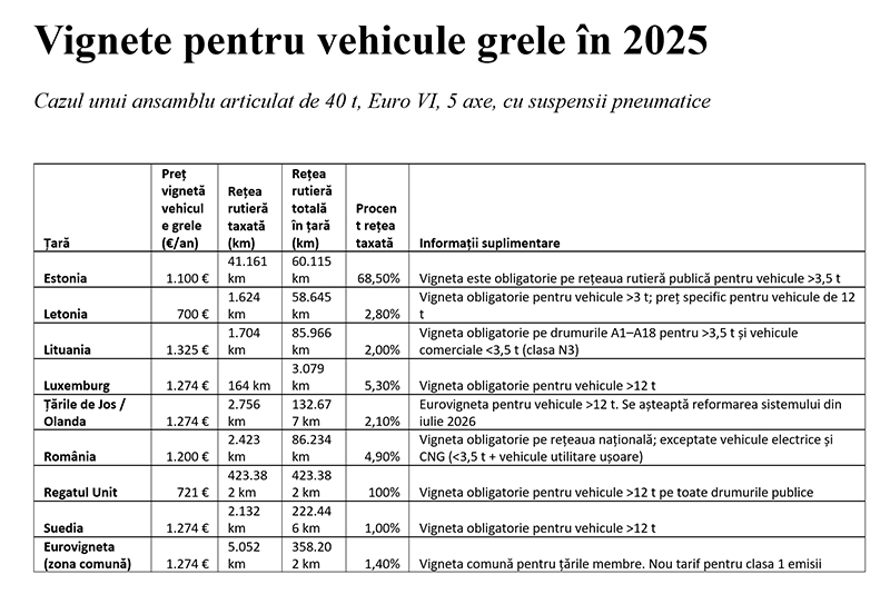 Vinietele sunt cuprinse între 700 de euro/an în Letonia și 1.325 de euro/an în Lituania, iar în cazul eurovinietei, valabile pe autostrăzile din Luxemburg, Olanda și Suedia, trebuie subliniat că Danemarca s-a retras în 2025 și aplică o taxă/km, calculată și în funcție de emisiile de CO2, și că noua grilă de tarifare ia în considerare emisiile de CO2.