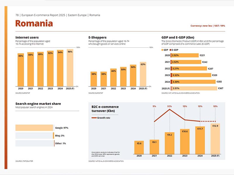 Conform European E-Commerce Report 2025, comerțul electronic din România este așteptat să atingă 3,5% din PIB în 2025, consolidându-și poziția printre primele zece state membre ale UE în ceea ce privește ponderea E-GDP. România ocupă locul nouă la nivel european și locul trei în Europa Centrală și de Est, fiind devansată doar de Polonia și Cehia.