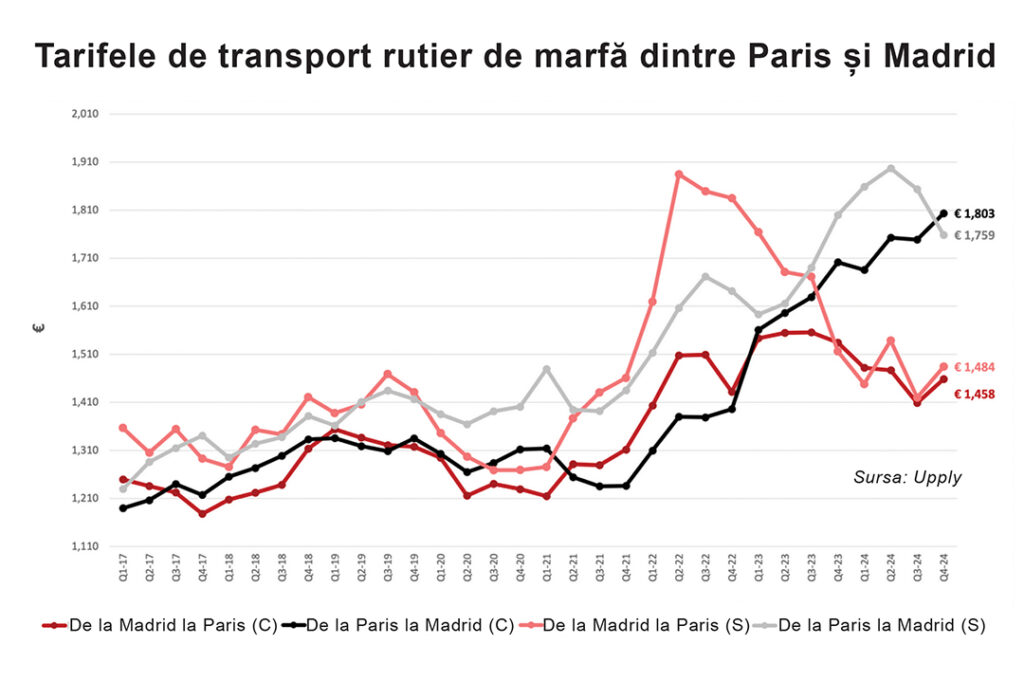 Pe sensul celălalt, de la Paris la Madrid, tarifele de transport pe bază de contract au crescut cu 3,1% față de trimestrul precedent și cu 6,0% față de trimestrul al patrulea din 2023, până la 1.803 euro (1,42 de euro/km), în timp ce tarifele spot au scăzut cu 5,1% față de trimestrul al treilea din 2024 și cu 2,3% față de trimestrul al patrulea din 2023.