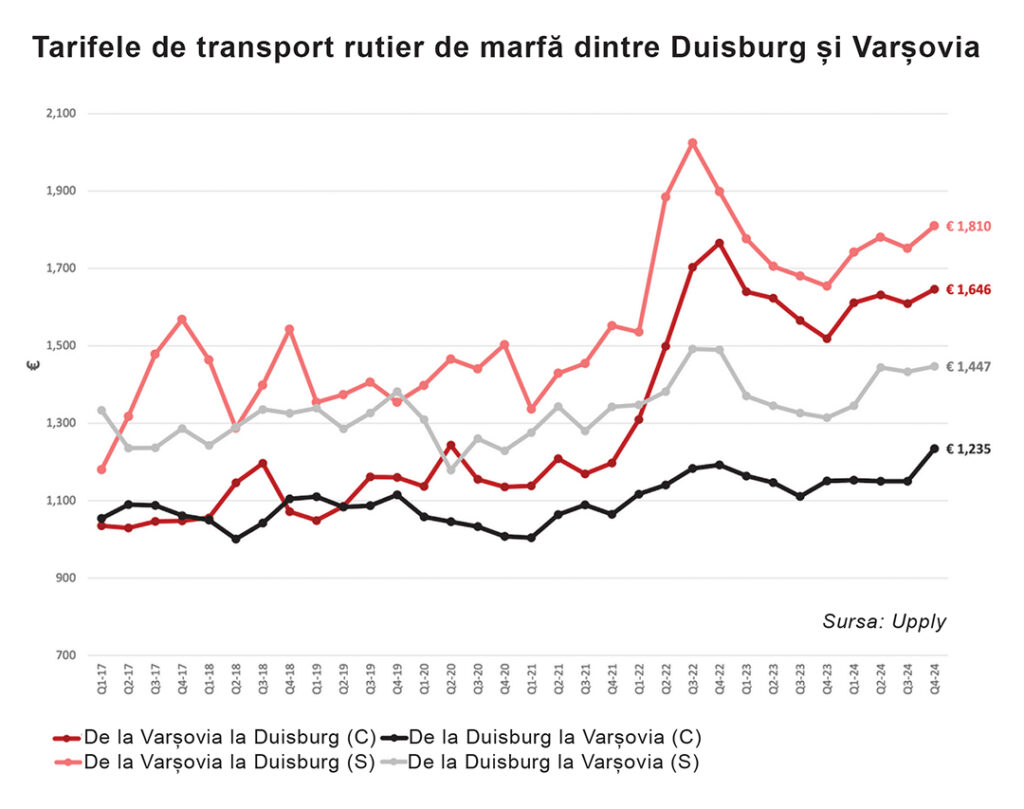 Pe ruta de la Varșovia la Duisburg, și tarifele de transport pe bază de contract, și tarifele spot au crescut comparativ cu trimestrul al treilea, cu 2,3%, respectiv 3,3%, ajungând la 1.646 de euro (1,52 de euro/km), respectiv 1.810 euro (1,68 de euro/km). Iar față de perioada similară din 2023 creșterile au fost de 8,4%, respectiv de 9,4%.