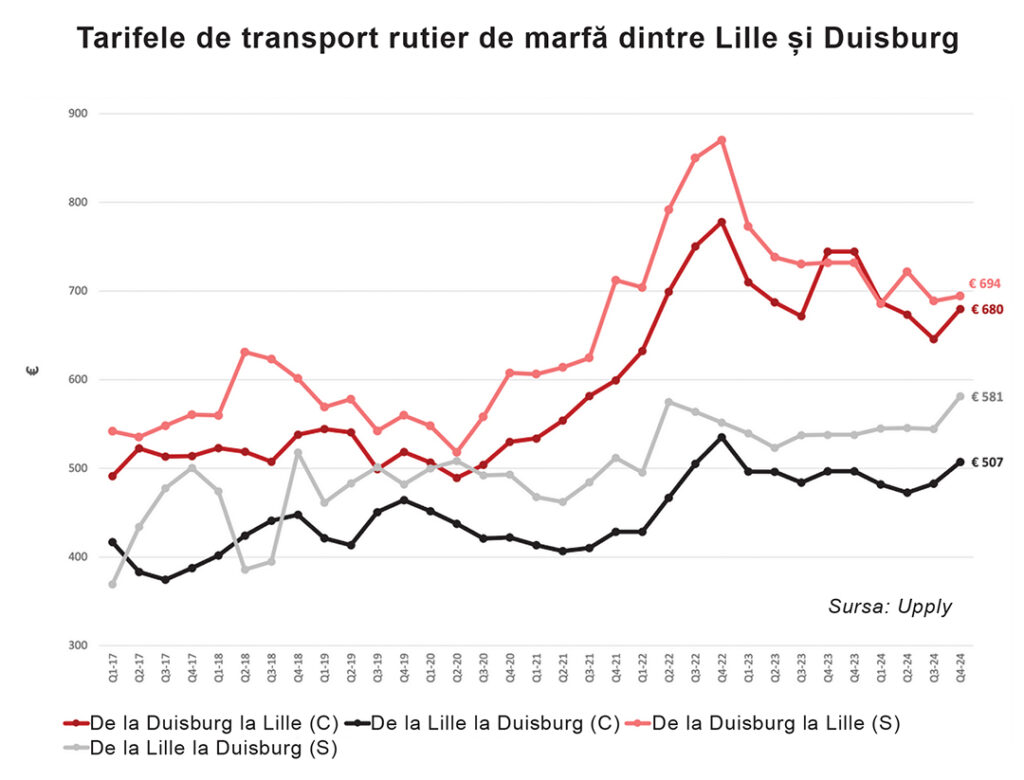Pentru transportul de la Duisburg la Lille, tarifele din contracte au crescut în trimestrul al patrulea din 2024 față de precedentul cu 5,3%, ajungând la 680 de euro (2,25 de euro/km), iar cele spot au fost relativ stabile (+0,8%), de 694 de euro (2,30 de euro/km). Față de perioada similară din 2023, tarifele din contracte au scăzut cu 8,7%, iar cele spot cu 5,2%.