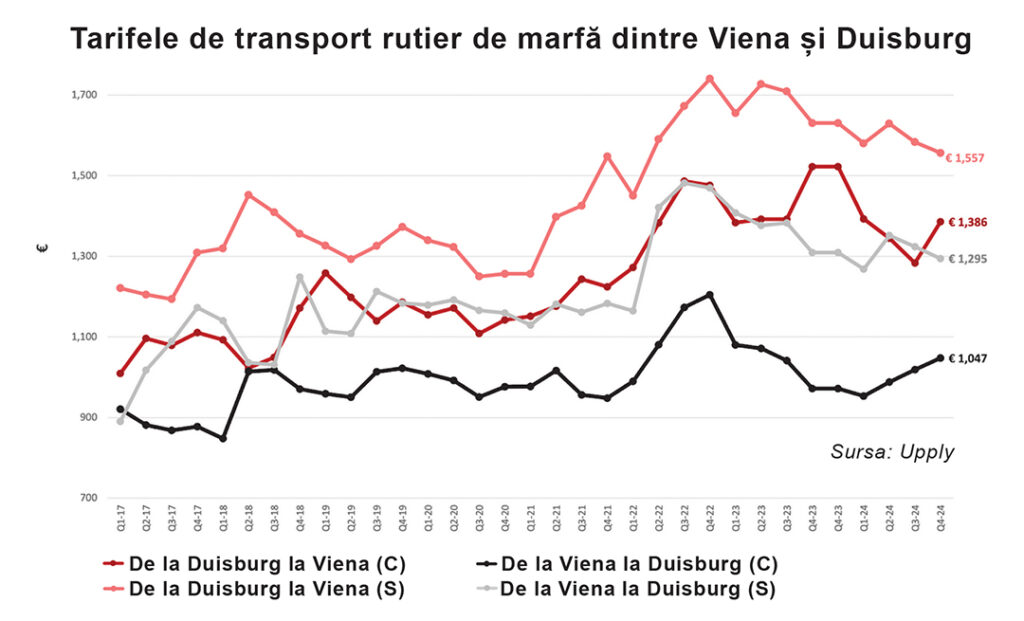 Pe ruta de la Duisburg la Viena, tarifele de transport pe bază de contract au crescut în trimestrul al patrulea din 2024 față de precedentul cu 8,0%, până la 1.386 de euro (1,45 de euro/km), și cele spot au scăzut cu 1,7%, până la 1.557 de euro (1,63 de euro/km). Comparativ cu trimestrul al patrulea din 2023, tarifele din contracte sunt mai mici cu 9,0%, și cele spot cu 4,6%.