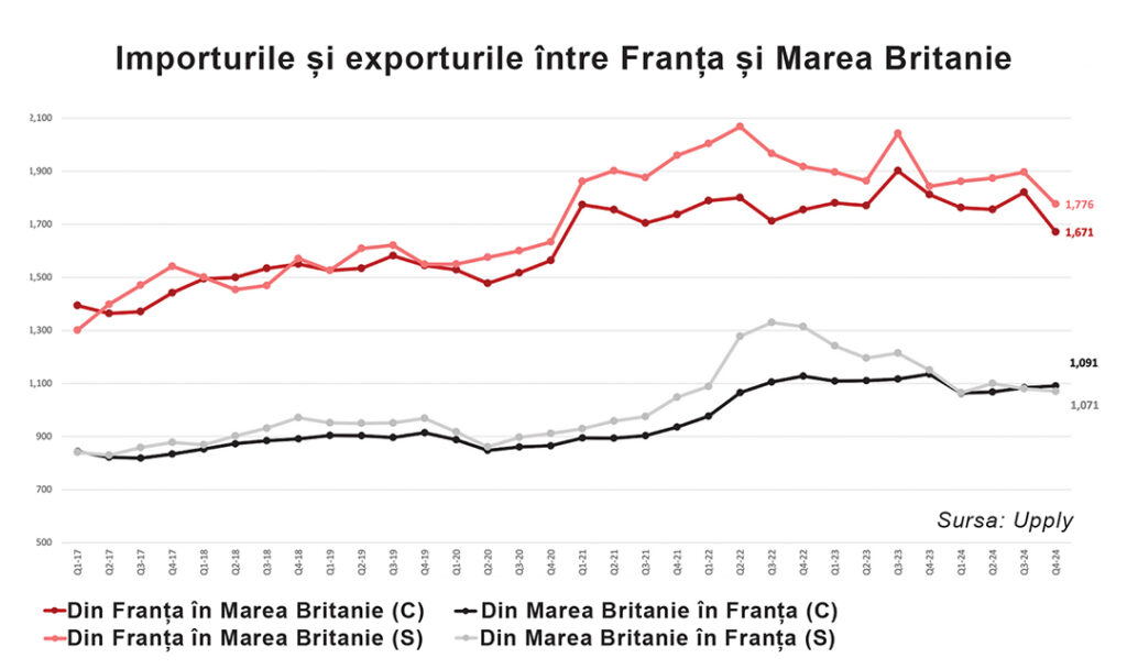Exporturile totale de bunuri ale Marii Britanii au scăzut ușor, cu 0,1 miliarde de lire sterline (0,4%), iar cele către țări din afara UE mai mult, cu 0,7 miliarde de lire sterline (4,6%). În schimb au crescut exporturile către UE, cu 0,6 miliarde de lire sterline (4,1%). În octombrie 2024, importurile din UE le-au depășit pe cele din țările terțe cu 4,4 miliarde de lire sterline, în timp ce exporturile către UE au fost cu doar 0,1 miliarde de lire sterline mai mari decât exporturile către țări din afara UE. Franța s-a clasat pe locul al patrulea ca partener comercial al Regatului Unit în patru trimestre, până în trimestrul al doilea din 2024, cu 6,0% din comerțul total al Marii Britanii. Dar din octombrie 2023 până în octombrie 2024 exporturile au scăzut cu 6,6%, în timp ce importurile de bunuri din Franța au scăzut cu 8,8% față de aceeași perioadă a anului precedent. Franța rămâne un partener comercial cheie în Marea Britanie, dar volumele tranzacțiilor au scăzut, ceea ce se vede în tendința de scădere a tarifelor.