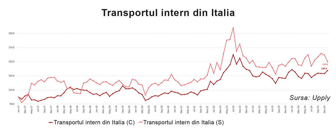Tarifele de transport intern pe bază de contract din Italia au crescut în medie cu 3,9 puncte în trimestrul al patrulea din 2024 față de al treilea, ajungând la 137,4 puncte în decembrie, cu 4,4 puncte mai mult decât în noiembrie. Dar tarifele spot au scăzut cu aproape 10,0 puncte, până la 149,8 în decembrie. Comparativ cu trimestrul al patrulea din 2023, tarifele din contracte au crescut cu 2,5 puncte, iar cele spot cu 0,6 puncte.
