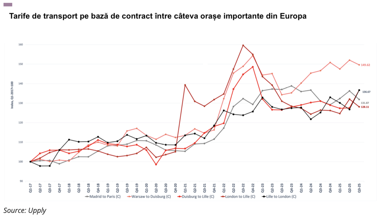 Pe de altă parte, tarifele de transport pe bază de contract de la Duisburg la Lille au fost de 136,7 puncte, adică 2,22 de euro/km, în creștere și față de trimestrul al doilea din 2025, cu 9,1 puncte, și față de trimestrul al treilea din 2024, cu 5,6 puncte.