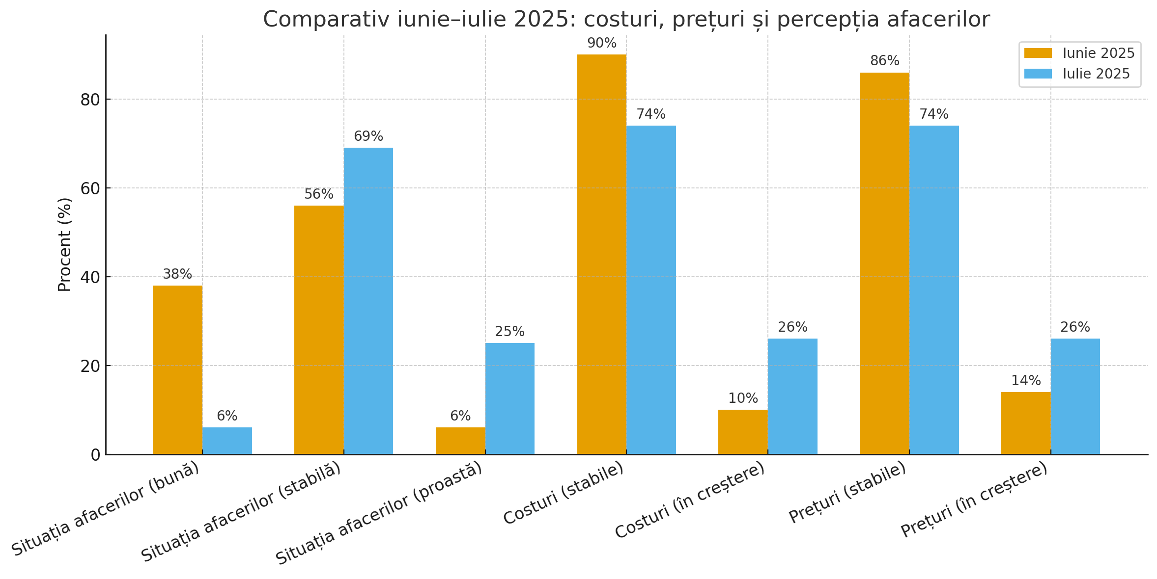 Un capitol sensibil rămâne cel al costurilor de operare. În iunie, peste 90% dintre operatori raportaseră costuri stabile și se așteptau ca această situație să continue și în următoarele trei luni. Realitatea a fost diferită: în iulie, aproape trei sferturi dintre companii au reușit să mențină un nivel constant al cheltuielilor, dar un sfert s-au confruntat deja cu majorări semnificative, în special din cauza combustibilului. Nicio firmă nu a raportat reduceri de costuri. Pentru trimestrul următor, prognozele nu sunt încurajatoare: companiile nu văd o posibilă scădere, ci mai degrabă o menținere la nivelul actual, considerat ridicat, sau chiar o creștere suplimentară.