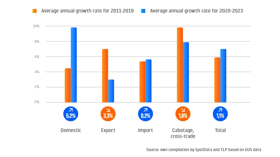 Începând din 2019, cea mai rapidă creștere a avut-o piața internă, cu o rată medie anuală de 9,7%, după câțiva ani în care cross trade și cabotajul au crescut cel mai mult. În timp ce exporturile și importurile au crescut cel mai lent. Aceste dinamici sunt date de schimbările în lanțurile de aprovizionare și de consolidarea schimburilor între fabricile din Polonia, de Pachetul Mobilitate care pune limite cabotajului și de dificultățile din economia Germaniei, pentru care se fac multe din cursele polonezilor în străinătate (31,9% din totalul volumelor lor din 2023, față de 10,2% în Franța și 8,2% în Italia). În 2023, transportul de marfă între Polonia și Germania s-a ridicat la 24 de miliarde de tone-km, urmat de cel cu Spania, cu 8,2, și de Olanda, cu 5,7. Ca greutate a încărcăturii firmele poloneze au ajuns în Germania la 45,6 milioane de tone în 2023 și ca performanță, la 16,7 miliarde t-km. Cabotajul realizat în Germania de camioane din toate celelalte țări UE este de 35,3 milioane de tone (cu 22,6% mai puțin decât al Poloniei) și de 9,0 miliarde t-km (cu 46,1% mai puțin decât al Poloniei), ceea ce arată poziția dominantă a transportatorilor polonezi în Germania față de cei din alte țări.