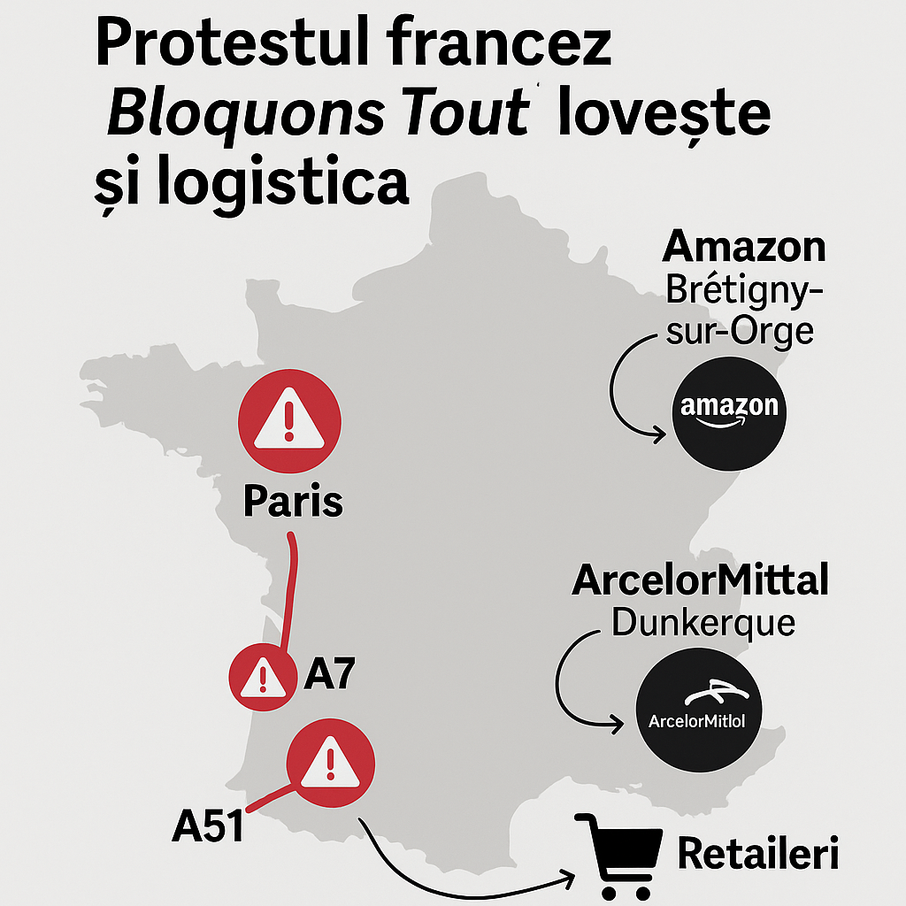 Industria logistică resimte deja primele consecințe majore. Platforma Amazon Brétigny-sur-Orge, unul dintre cele mai importante centre de distribuție din regiunea pariziană, a fost complet blocată de greviști. De asemenea, gigantul siderurgic ArcelorMittal Dunkerque a fost nevoit să oprească parțial producția, semnalând riscuri de întrerupere a lanțului industrial.