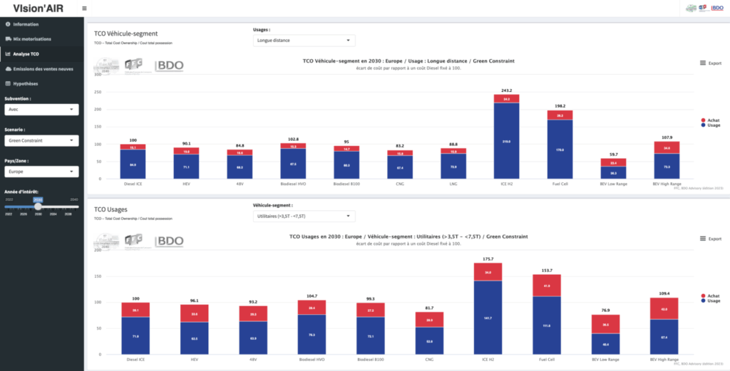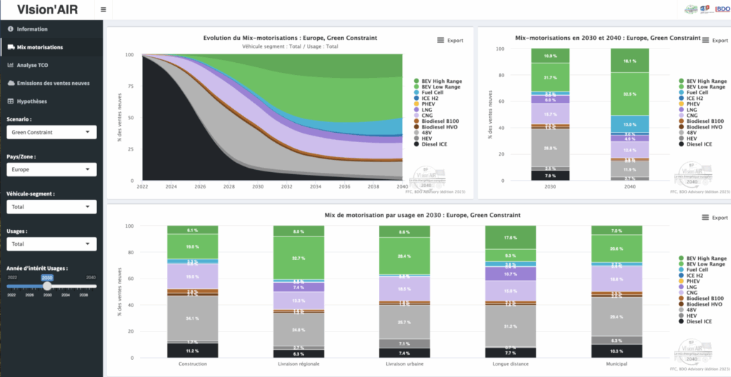 Vision’AIR mai estimează că în 2030 în Europa 44% din piața de peste 3,5 t vor fi vehicule cu motorizări alternative: 21% pe gaz, 17% electrice, 4% pe hidrogen și 2% pe biodiesel. În Franța, datorită prețului mai mic al electricității față de media europeană, procentele sunt puțin diferite: 24% sunt vehicule electrice, 23% pe gaz, 5% pe biodiesel și 4% pe hidrogen.