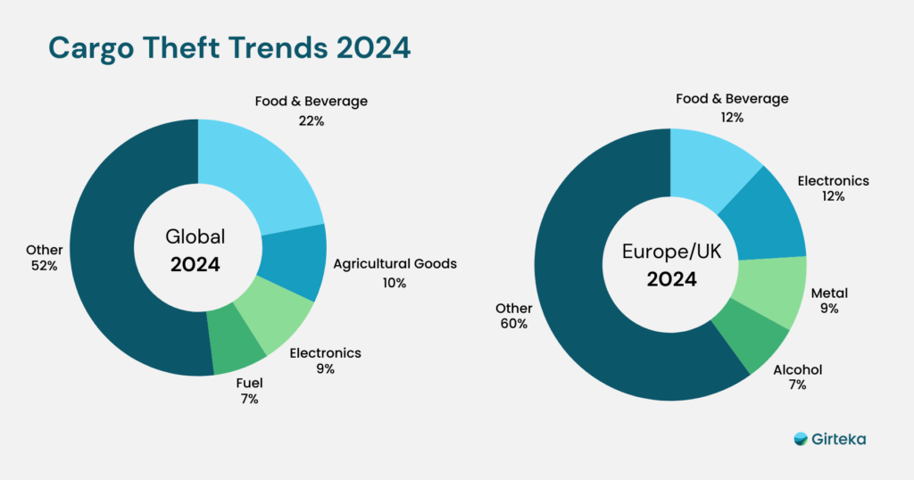 Hoții vizează în mod strategic mărfurile valoroase, ușor de transportat, cu cerere constantă și ușor de revândut pe piața neagră. Pe baza datelor din 2024, produsele alimentare și băuturile au dominat în mod constant lista mărfurilor vizate la nivel global, 76% din furturi implicând camioane ca modalitate, comparativ cu 68% în 2023.