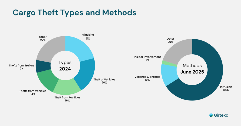 Datele din 2024 arată că cele mai frecvente incidente implică deturnarea (21%), furtul de vehicule (20%), urmat de furtul din facilități (16%) și furtul din vehicule (14%) și containere/remorci (7%).