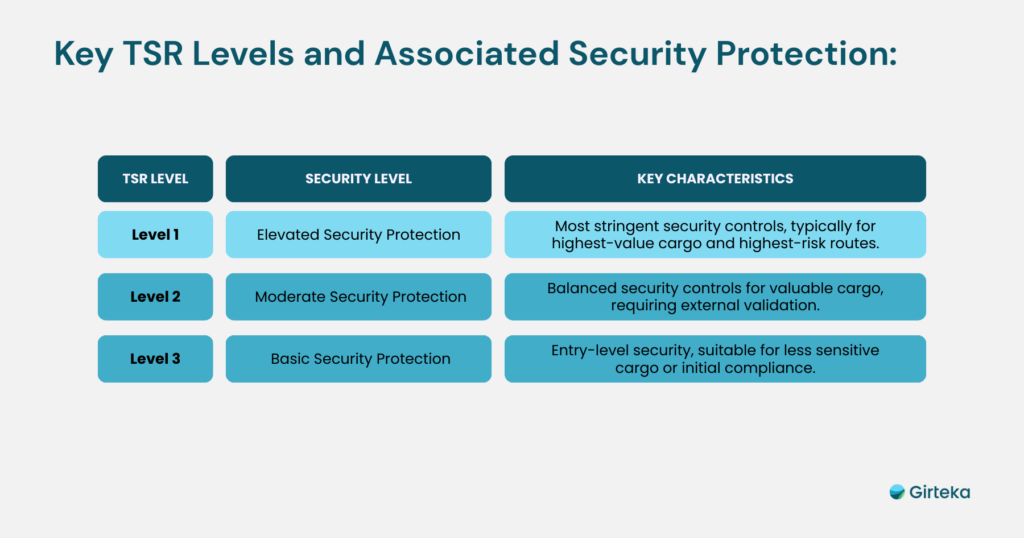 Standardul TSR definește cerințele minime de securitate pentru operațiunile de transport rutier, acoperind remorcile cu pereți rigizi/flexibili, camioanele, furgonetele rigide și chiar transportul rutier al containerelor maritime. Acesta stabilește procesele, tehnologiile și protocoalele legate de securitate pe care companiile de transport trebuie să le implementeze pentru a proteja mărfurile împotriva furtului.