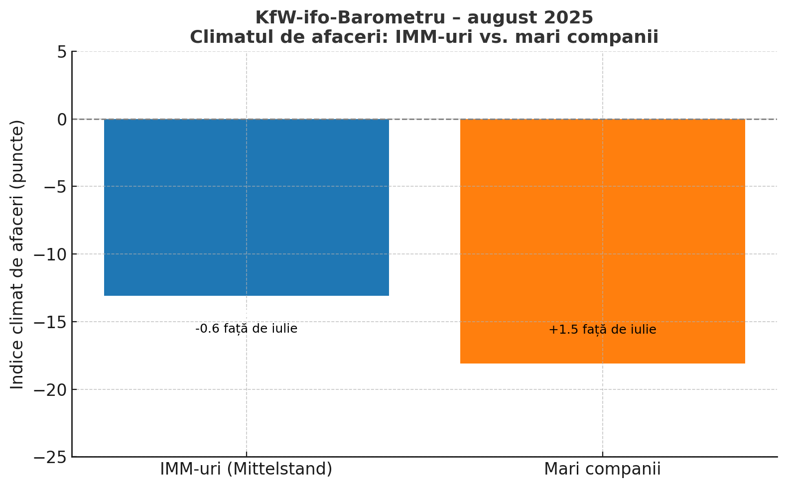 Spre deosebire de IMM-uri, marile companii au raportat o ușoară creștere a încrederii în august. Indicele climatului de afaceri pentru acestea a urcat cu 1,5 puncte, până la –18,1 puncte. Evaluarea situației actuale a fost totuși mai slabă, dar așteptările pentru lunile următoare s-au îmbunătățit vizibil, ceea ce indică un optimism mai accentuat față de perspectivele pe termen scurt.