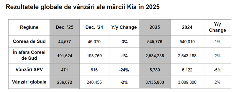 Kia Corporation a anunțat vânzări totale de 3.135.803 automobile pentru 2025, în creștere cu 2% față de anul precedent. Performanța marchează cel mai bun an din istoria mărcii în ceea ce privește vânzările globale.