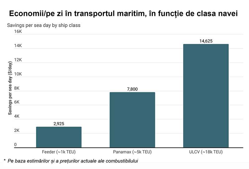În graficul alăturat sunt prezentate economiile care se pot face zilnic în transportul maritim și, chiar dacă ele pot părea nesemnificative, totalurile sunt considerabile, deci propulsia folosind energia vântului aduce și economie de combustibil, și costuri mai mici cu emisiile de carbon care au apărut în 2024, de când în UE se aplică sistemul de tranzacționare a acestora.