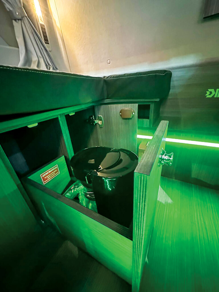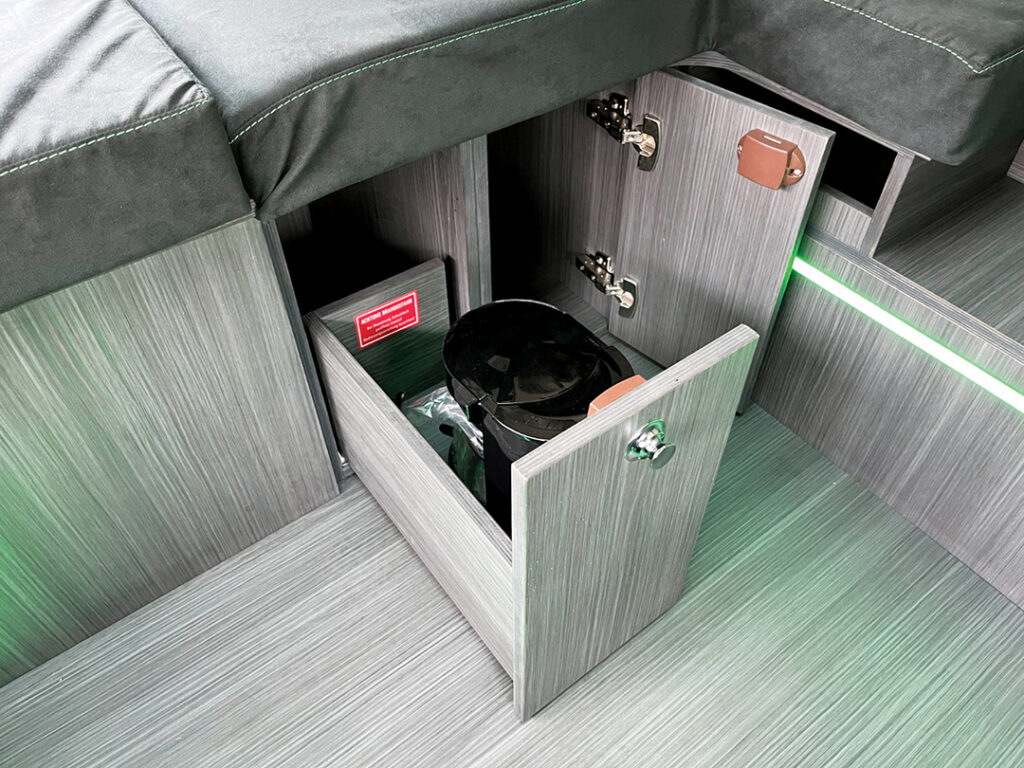 Bancheta de dormit a fost păstrată în aceeași poziție ca la camionul standard, fiind rabatată pentru a face mai mult loc de mișcare în cabină. În dulăpiorul de pe peretele lateral, din prelungirea stâlpului de susținere a cabinei din spatele locului șoferului, dintr‑un sertar iese la iveală o chiuvetă micuță, dar foarte utilă pentru spălat pe dinți, pe mâini sau a spăla un fruct la nevoie. Iar deasupra acestui dulap este montat un cuptor cu microunde.