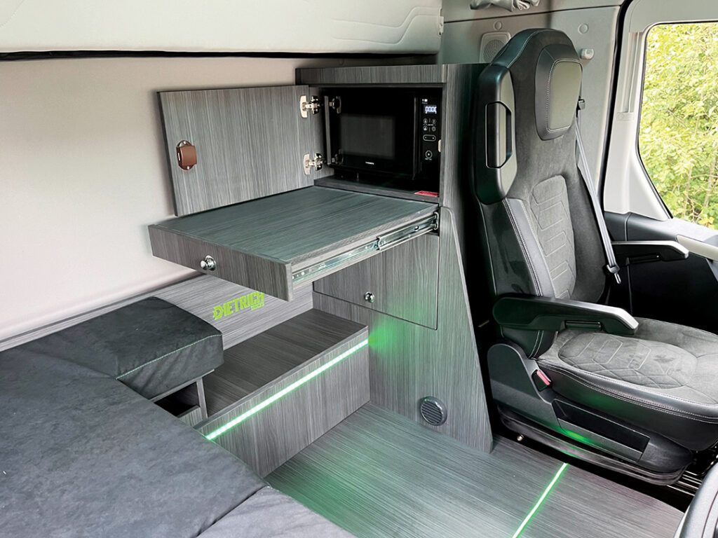 Dietrich a mutat una dintre banchete paralel cu scaunul șoferului, în dreptul geamului lateral, înlocuind, practic, scaunul pasagerului. Această banchetă pentru repausul pe timpul zilei are sub salteaua din două bucăți mai multe dulapuri pentru stocarea diferitelor bagaje ale șoferului, ultimul sertar, de lângă peretele din spate al cabinei, conținând o cafetieră. Sub prima saltea, aproape de panoul de bord, este poziționat un frigider suficient de mare pentru a asigura cele necesare unui șofer pe perioada repausului zilnic sau săptămânal.