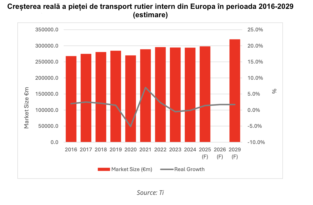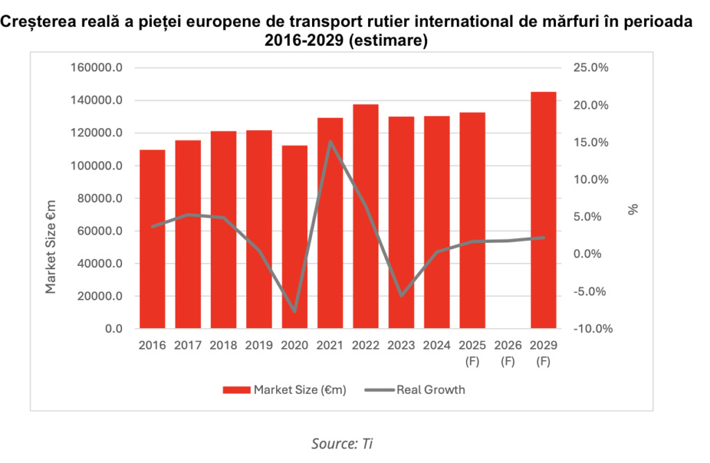 Piața europeană de transport rutier de marfă ar putea fi în 2025 cu 1,5% mai mare în termeni reali decât în 2024, adică ar ajunge la o valoare totală de 430.859,1 milioane de euro, conform unui raport Ti Insight. 298.221,6 milioane de euro ar provenit din transport intern, unde creșterea față de 2024 ar fi de 1,4%, iar 132.637,5 milioane de euro din transport internațional, unde creșterea pare mai rapidă, de circa 1,7%.