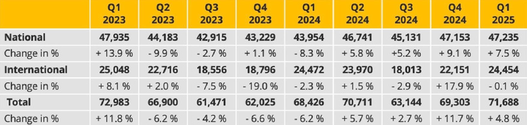 Motorul creșterii a fost piața internă, unde volumele au fost cu 2,7% mai mari decât în 2023, pe fondul creșterii generale a economiei spaniole, determinate mai ales de consumul gospodăriilor. Recuperarea a avut loc în trimestrul al doilea și s-a accelerat în al patrulea, așa cum se poate vedea și în tabelul alăturat. Iar tendința de creștere a continuat în primul trimestru din 2025, când volumele de transport rutier pentru terți exprimate în tone au crescut cu 7,4%.