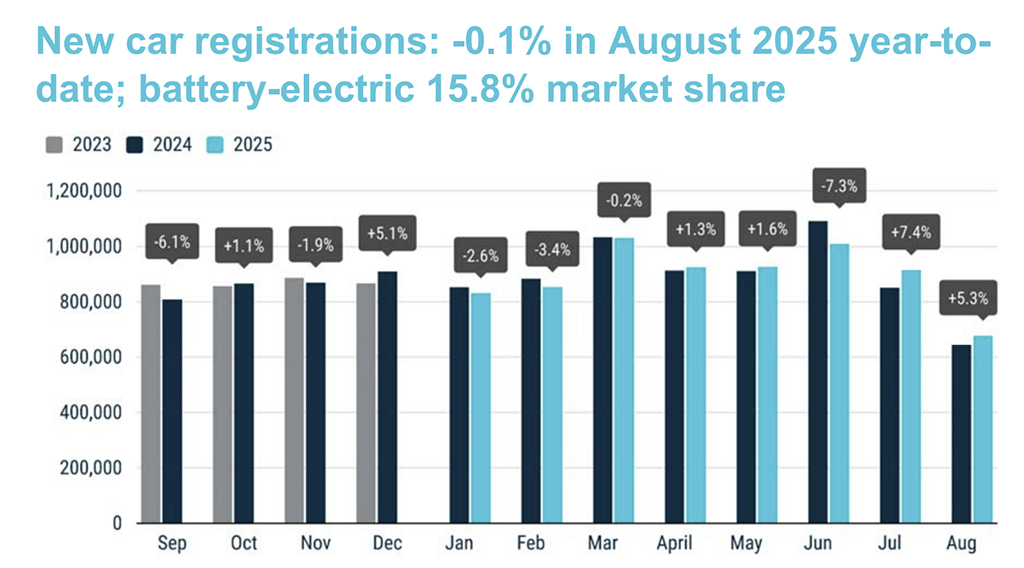 În perioada ianuarie–august 2025, în Uniunea Europeană au fost înmatriculate 7.168.848 de autoturisme, ceea ce reprezintă o scădere ușoară, de 0,1%, comparativ cu primele opt luni din 2024, în ciuda unei creșteri pozitive pentru a doua lună consecutivă. Cota de piață a autovehiculelor electrice pentru perioada ianuarie-august 2025 s-a menținut la 15,8%, încă sub ritmul necesar în această etapă a tranziției. Autovehiculele hibrid electrice au rămas cele mai populare tipuri de motorizări în rândul cumpărătorilor.