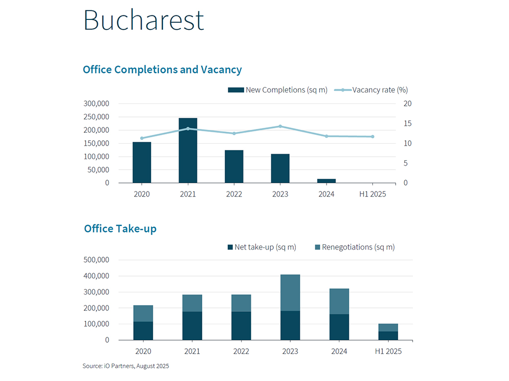 În prima jumătate a lui 2025, stocul de birouri din CEE a crescut cu 174.000 mp, însă cele mai mari creșteri au fost în Varșovia (85.000 m²) și Belgrad (69.000 m²). În Bratislava și București nu a fost adăugat niciun stoc nou, potrivit raportului iO Partners și JLL.
