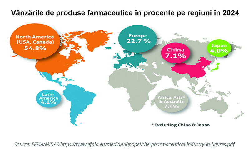 Așa cum puteți vedea în harta alăturată, America de Nord este cea mai mare piață pentru servicii de sănătate, urmată de Europa, dar, ca întotdeauna în cazul statisticilor economice, trebuie prudență în interpretarea cifrelor, atenționează analiștii Ti Insight. America de Nord, în special SUA, are cheltuieli/cap de locuitor foarte ridicate, însă asta se datorează probabil unei baze de costuri ridicate, inclusiv pentru produsele farmaceutice. În SUA, aproximativ o treime din costurile de sănătate sunt reprezentate de produsele farmaceutice și echipamentele medicale. În ceea ce privește volumul de produse farmaceutice consumate, Japonia, unele țări europene, Australia și alte state dezvoltate sunt probabil mai mari decât sugerează cheltuielile. Iar China a crescut substanțial și reprezintă acum o piață mare, dar, aparent, dificilă, cu bariere neobișnuite la intrare, caracteristice economiei chineze în ansamblu.