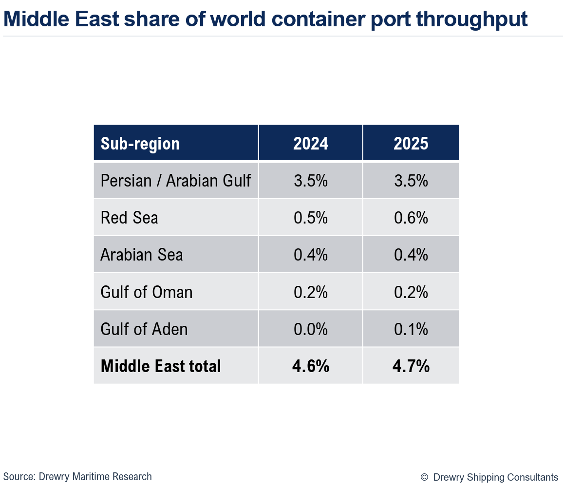 Potrivit analizei Drewry, toate aceste porturi au avantaje și dezavantaje, precum și zone de acoperire diferite. În actualul context, ele pot prelua o parte din volumele redirecționate și pot deveni puncte de acces mai sigure către regiune. „Porturile situate chiar în afara Strâmtorii Hormuz (Khor Fakkan), în Golful Oman (Salalah), în Marea Roșie (Jeddah și, eventual, Aqaba) și în estul Mediteranei au toate oportunități de a atrage volumele din Golf și de a acționa ca viitoare porți de acces mai sigure către Orientul Mijlociu”, adaugă Simon Heaney.