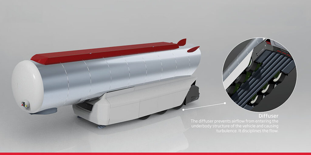 O altă componentă acoperă complet partea inferioară a ansamblului format din șasiu și axe, dirijează fluxul de aer și elimină turbulențele, ceea ce scade rezistența aerului și îmbunătățește eficiența aerodinamică.