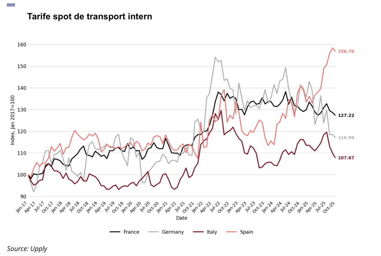 Pe de altă parte, Spania este, dintre țările analizate de Upply, care sunt principalele economii europene, singura unde indicele tarifelor spot de transport intern, care a fost în octombrie de 156,7 puncte, a scăzut, e drept, cu 1,7 puncte față de luna precedentă, dar a crescut cu 6,1 puncte față de iulie 2025 și cu 16,1 puncte față de octombrie 2024.