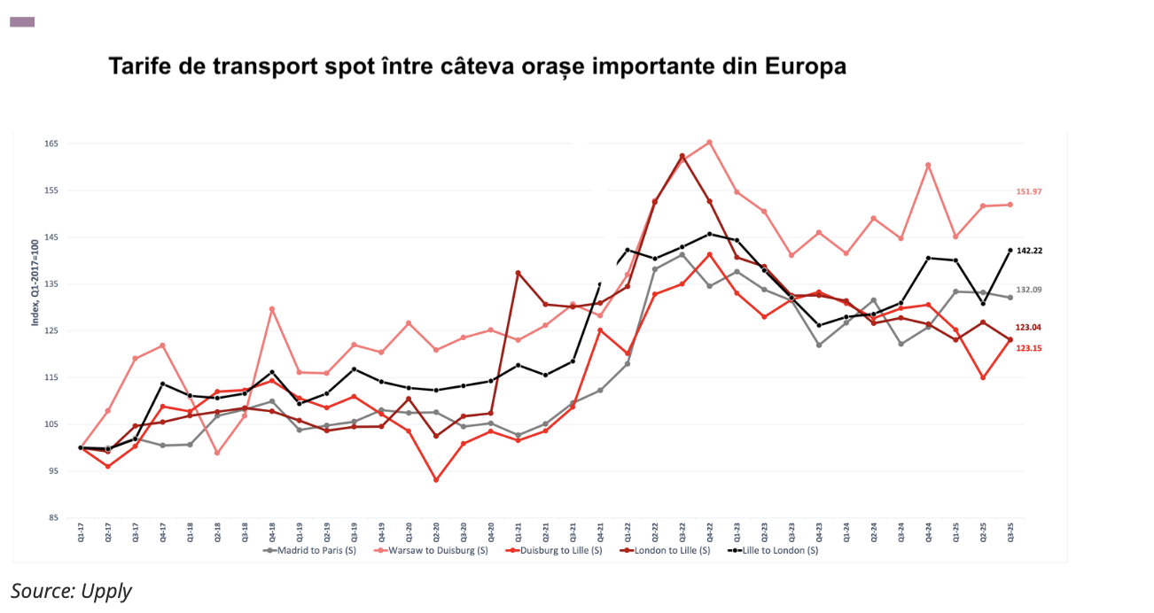 Tarifele spot de la Varșovia la Duisburg au fost de 152,0 puncte, adică 1,30 de euro/km, mai mari și decât în trimestrul anterior, cu 0,3 puncte, și decât în trimestrul al treilea din 2024, cu 7,2 puncte.
