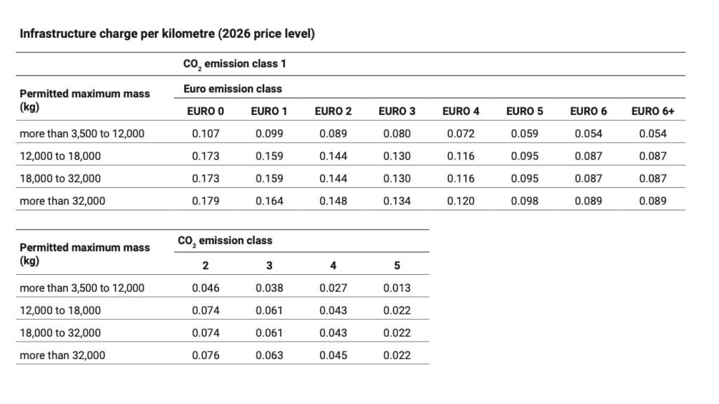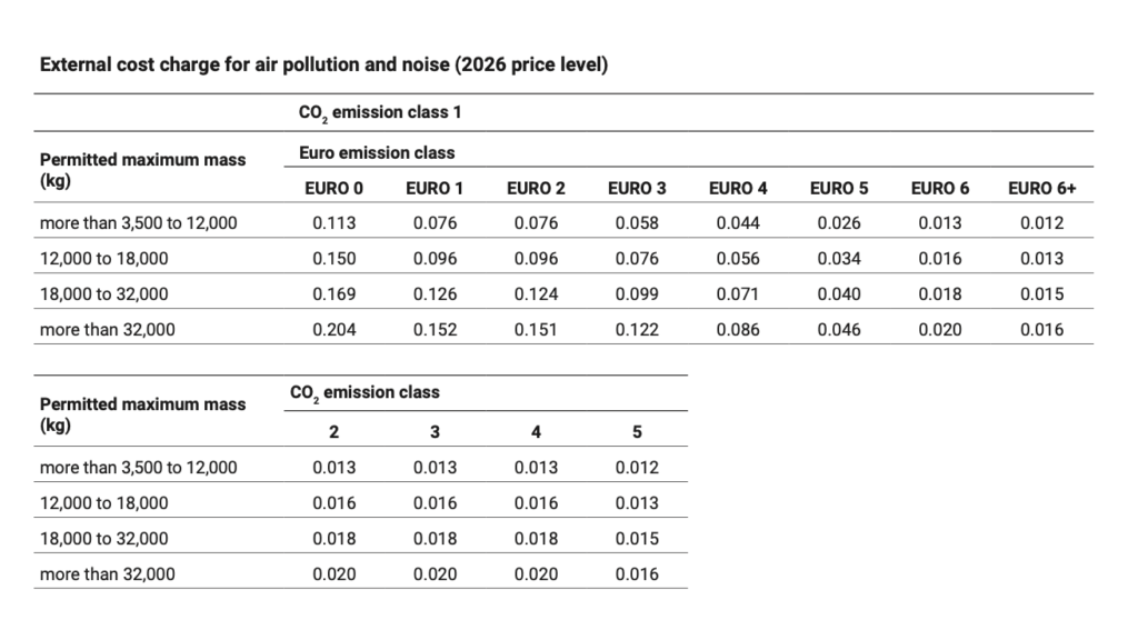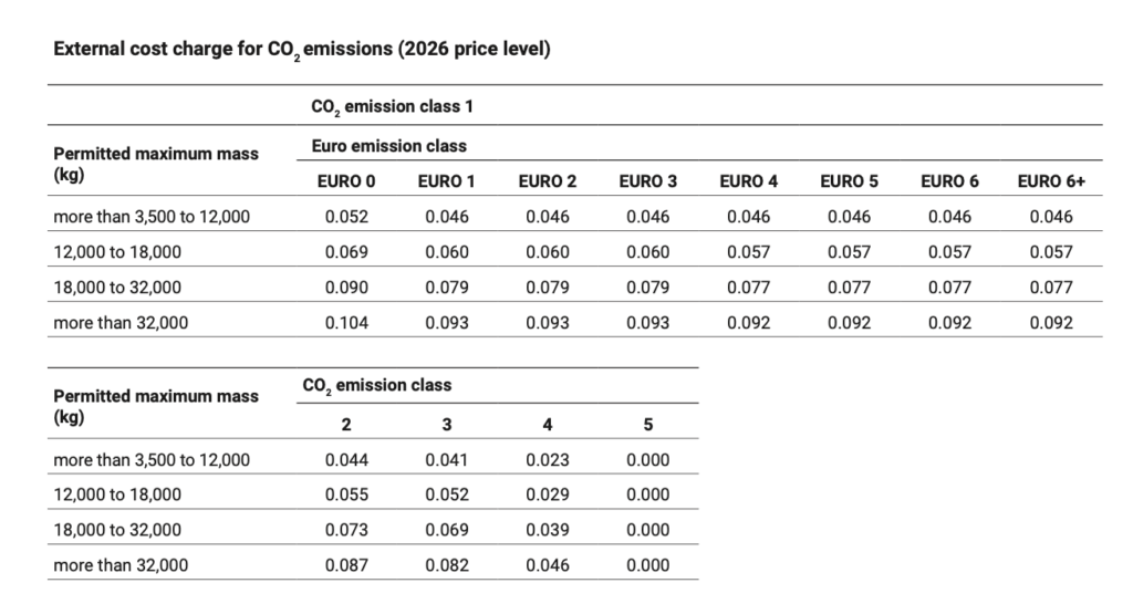 Structura taxei are trei componente: o taxă de infrastructură, o componentă aferentă costurilor externe generate de poluarea aerului și zgomot și o componentă aferentă emisiilor de CO2. Documentul oficial arată că, pentru camioanele din clasa CO2 5, componenta de CO2 este zero, ceea ce reduce puternic costul total per kilometru și creează un avantaj clar pentru vehiculele cu emisii foarte reduse.