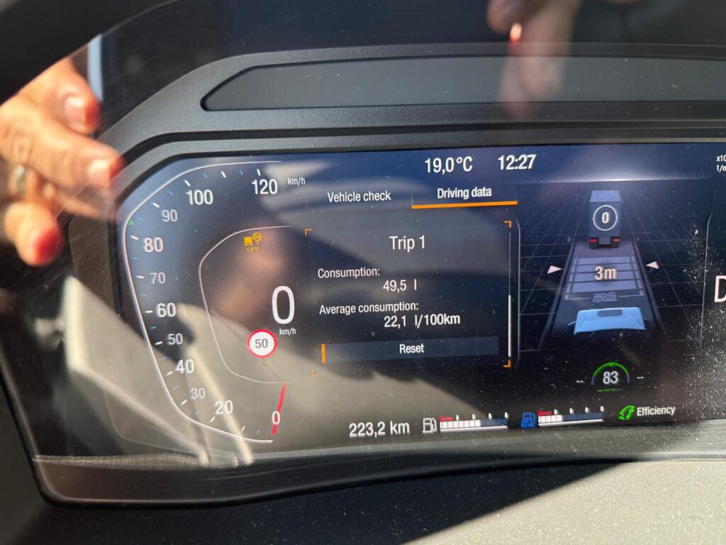Testul de consum desfăşurat în Germania, în jurul oraşului Muenchen, pe o distanţă de aproape 224 km, s-a încheiat cu un consum mediu de 22,1 l la 100 km, cu o greutate totală a ansamblului de 38,8 t şi cu o viteză medie de deplasare de 76,1 km/h. Traseul a combinat drumuri regionale (16% din traseu, potrivit raportului descărcat din sistemul telematic), câţiva kilometri în oraş (4% din traseu) şi mai multe porţiuni de autostradă (79%).