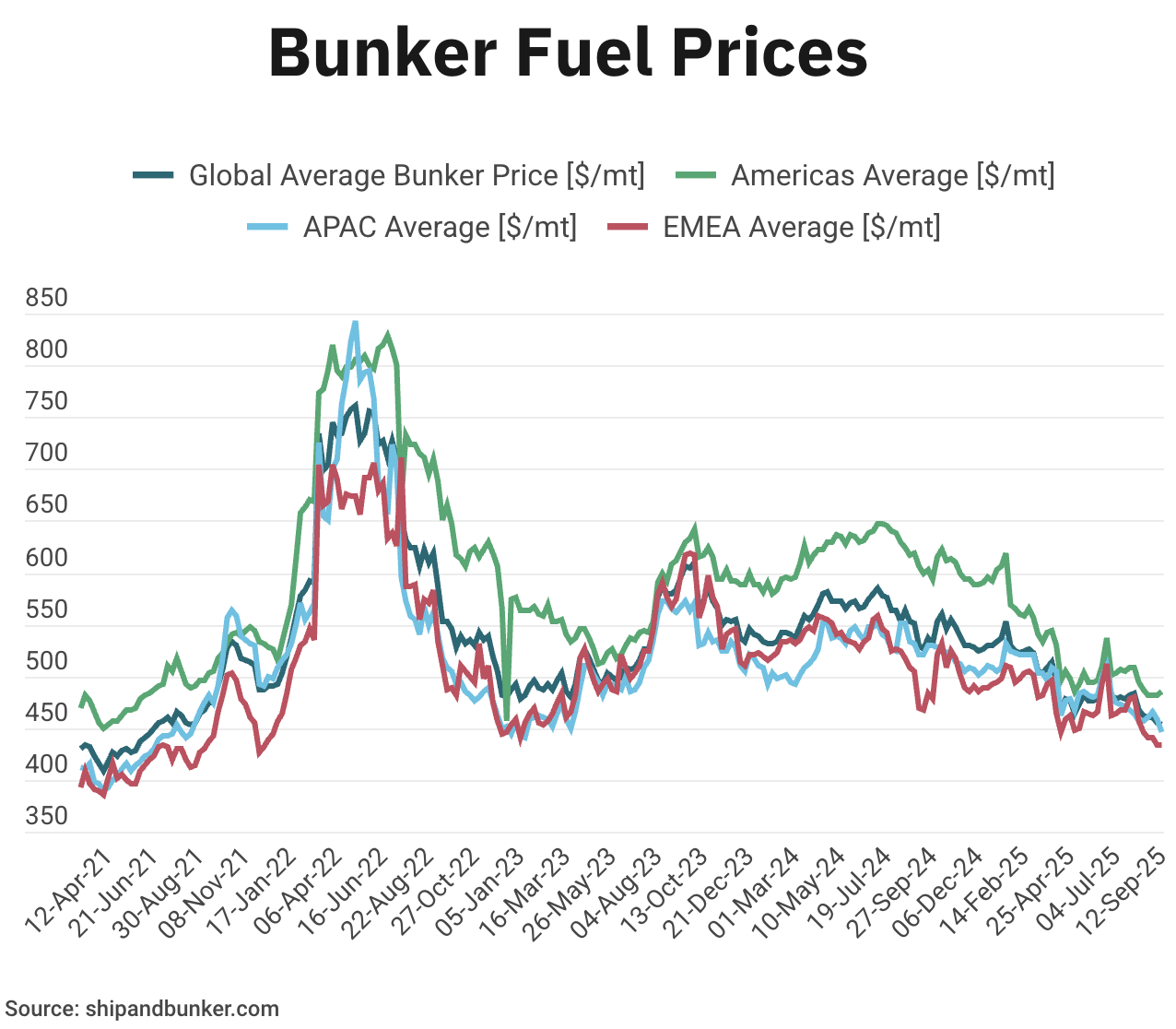 America rămâne cea mai scumpă piață pentru combustibilul folosit în transportul maritim, prețurile fiind în medie de circa 484,5 dolari/mt în săptămâna cu 12 septembrie, în scădere de la 510,7 dolari/mt în iunie, dar încă la un nivel mai mare decât în alte regiuni din cauza întreruperilor unor rafinării și a cererii persistente din unele hub-uri.