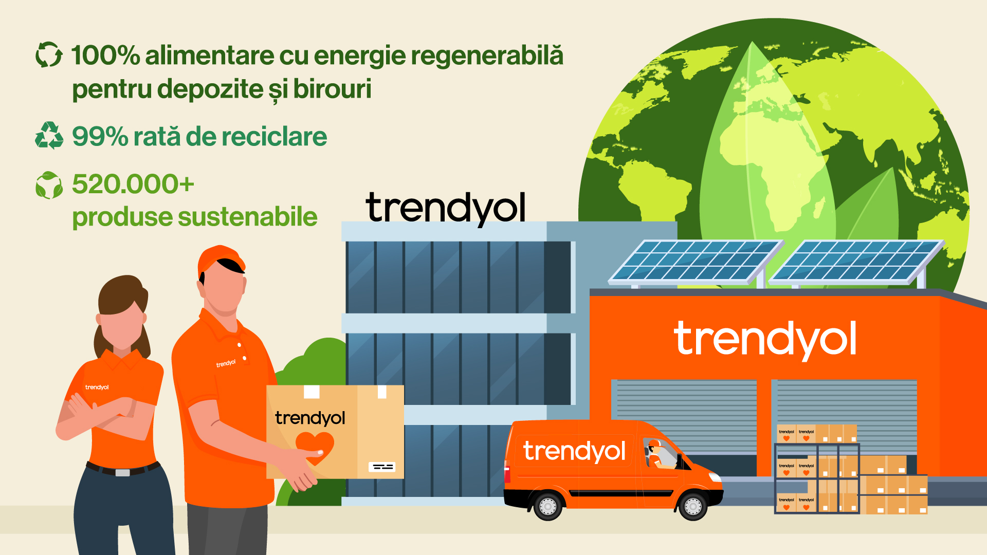 Tranziția la energie electrică certificată I-REC acoperă peste 300 de locații Trendyol, incluzând toate birourile și centrele de distribuție și transfer. Începând cu acest an, compania operează și un centru logistic dedicat în România, la Ștefăneștii de Jos, lângă București, integrat în aceeași abordare de utilizare a energiei verzi.