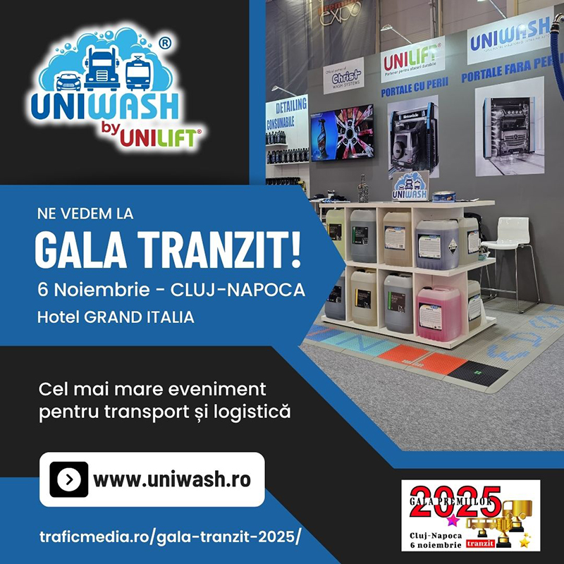 Reprezentanții Uniwash vor fi prezenți la Gala Tranzit 2025, care va avea loc pe 6 noiembrie, la Grand Hotel Italia din Cluj-Napoca, pentru a discuta cu transportatorii, operatorii de flote și partenerii din logistică despre cele mai eficiente soluții de spălare profesională.