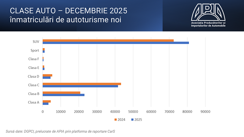 În decembrie 2025 s-au înmatriculat 21.203 unități, în creștere cu +58,4% față de decembrie 2024. La nivel anual, autoturismele au totalizat 155.855 unități, înregistrând un avans de +4,7%, peste nivelul prognozat.