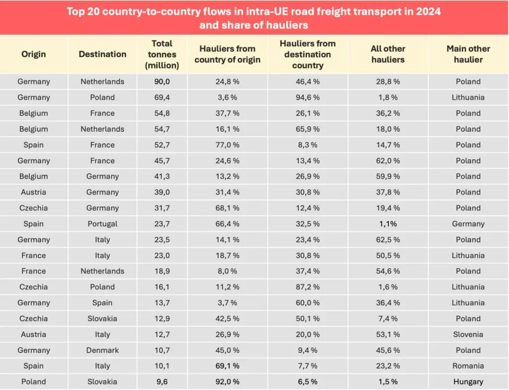 În ciuda dificultăților sale, Germania rămâne principalul furnizor de trafic intra-european, nouă din primele 20 de relații în ceea ce privește tonajul având origine sau destinație acolo. Această situație favorizează flota poloneză, liderul detașat pe ruta Germania-Polonia, care domină piața pe multe alte rute importante, în special Germania-Franța, Belgia-Germania sau Germania-Italia. Flota lituaniană, care a înregistrat o creștere de 17,2% a tonajului pe rutele internaționale în 2024 comparativ cu 2023, a câștigat cotă de piață mai ales pe ruta Franța-Italia, unde acum are mai mult de jumătate din totalul tonelor transportate.