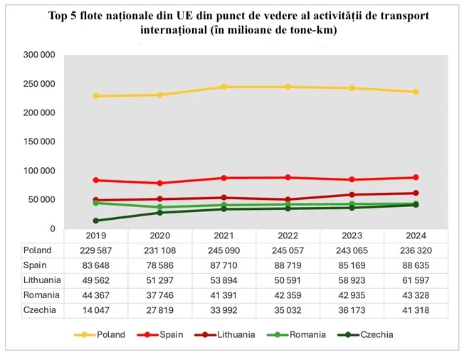 Spania a profitat pe deplin de performanța bună a economiei sale pentru a crește transportul internațional realizat de flota sa, exprimat în tone-km, cu 4,2% în 2024 față de 2023 și cu 1,2%/an între 2019 și 2024. Iar ca tonaj creșterea a fost de 5% față de 2023 și de 1,9%/an în ultimii șase ani.